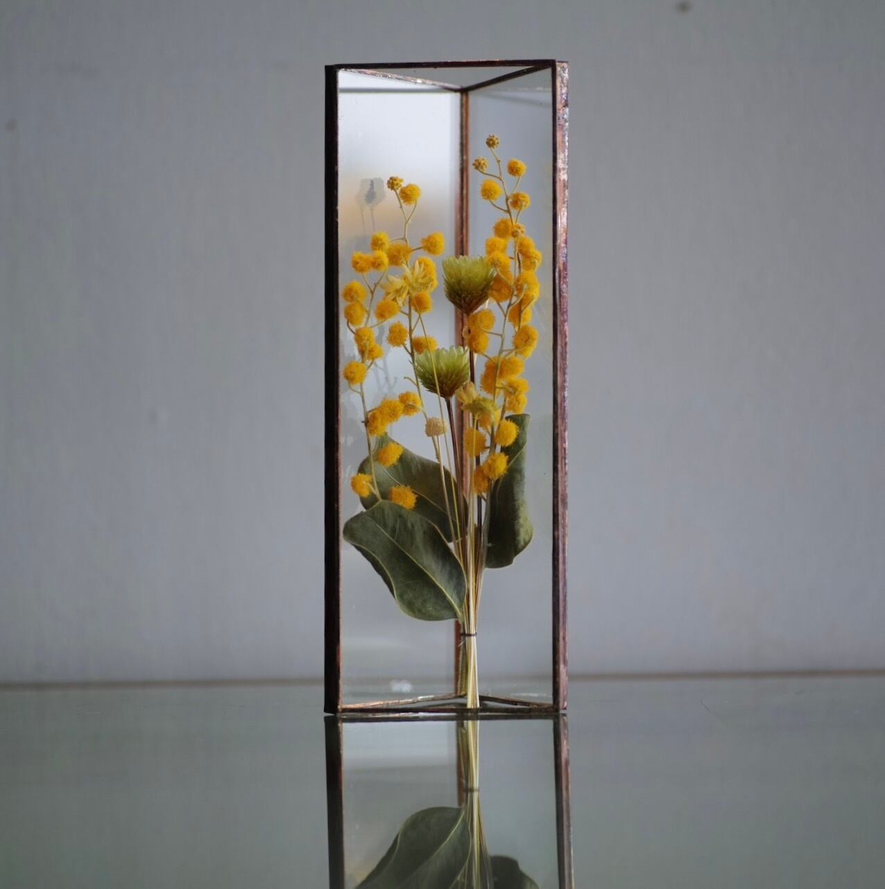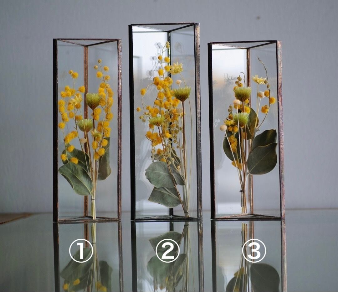 植物を三角ガラス容器に挟み込みました。縦置き・横置きどちらも可。