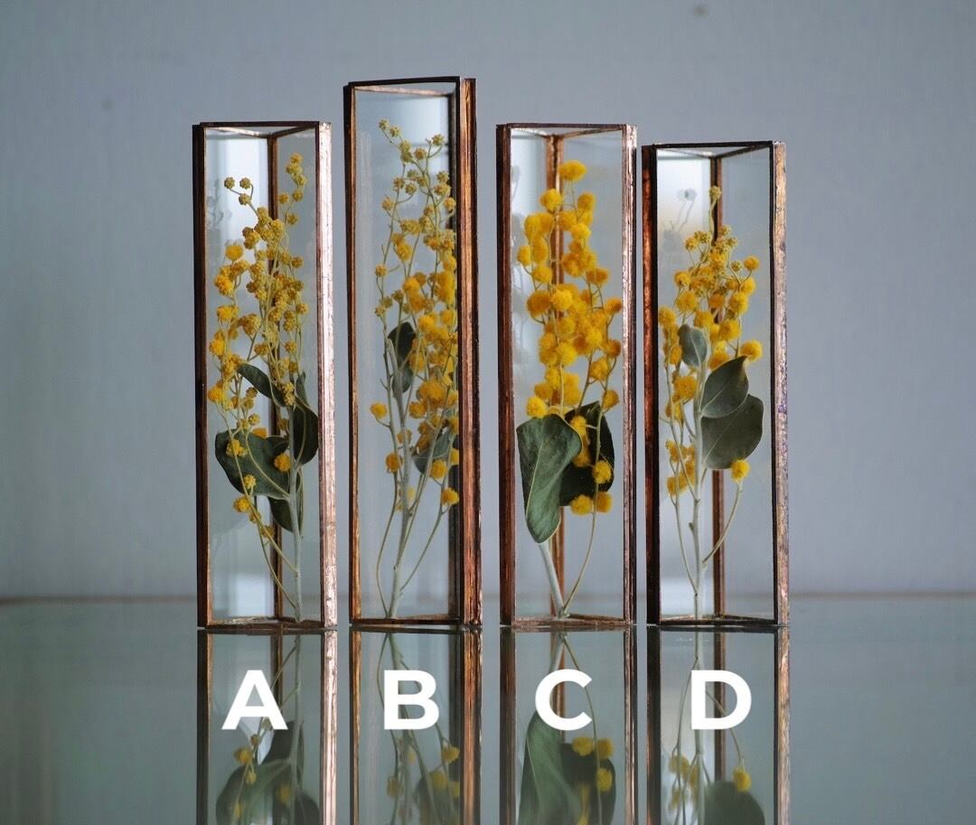 植物を三角ガラス容器に挟み込みました。縦置き・横置きどちらも可。