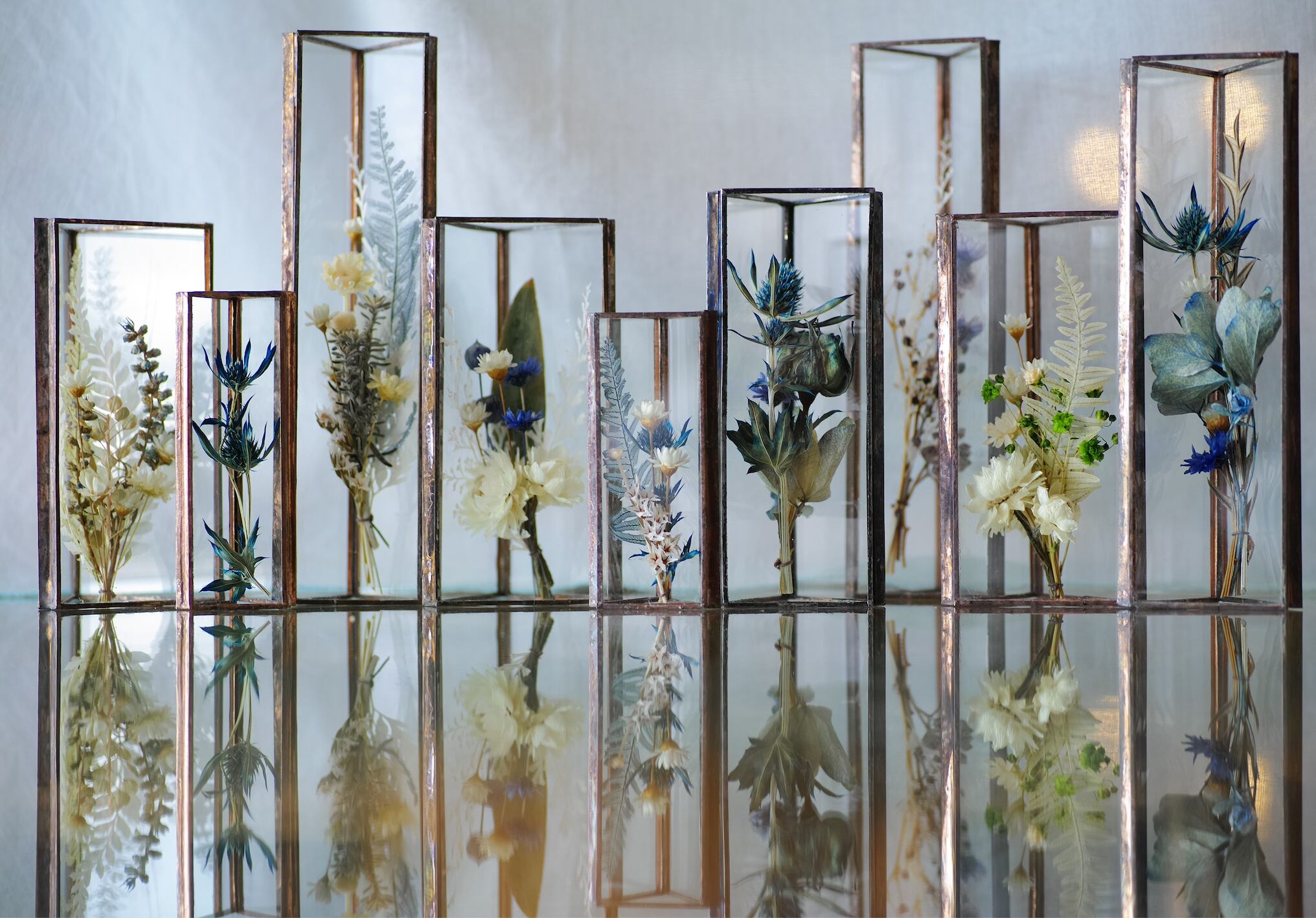 植物を三角ガラス容器に挟み込みました。縦置き・横置きどちらも可。