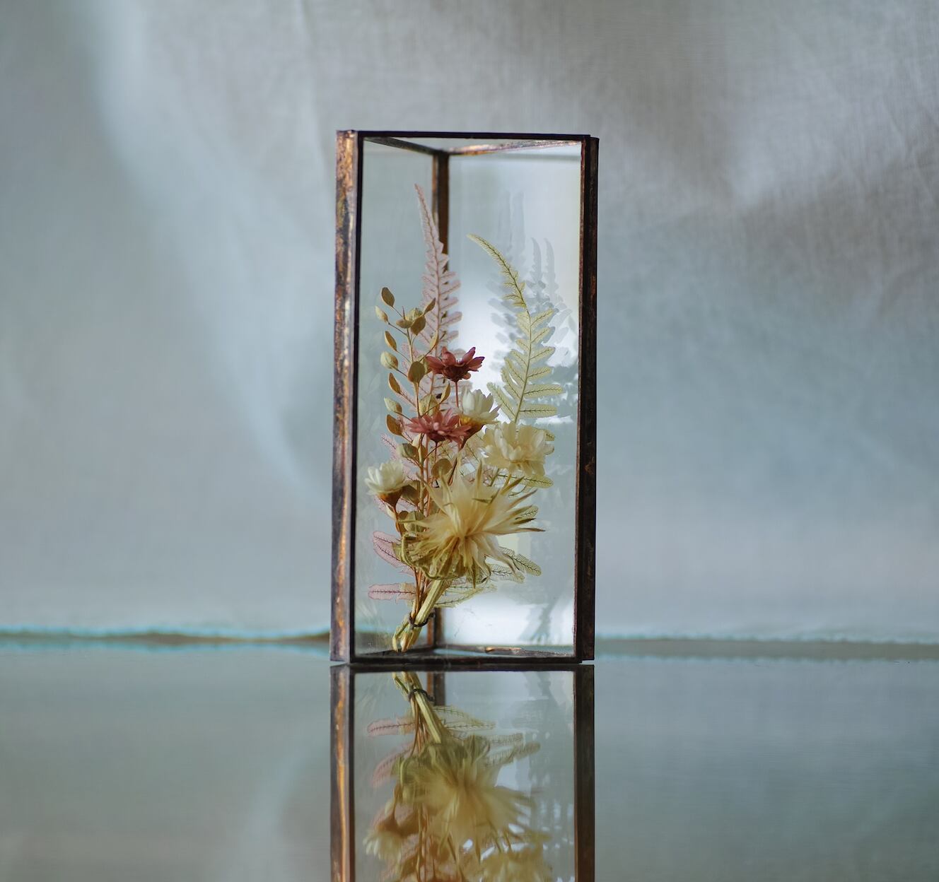 植物を三角ガラス容器に挟み込みました。縦置き・横置きどちらも可。