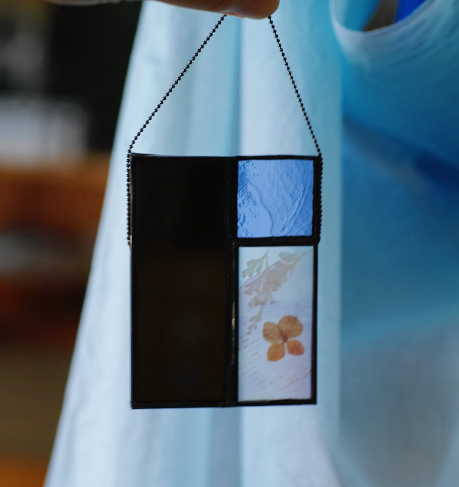 素材:kiyoharaharuka テキスタイル、ガラス、ミラー、ハンダ、カッパーテープ(黒)、押し花