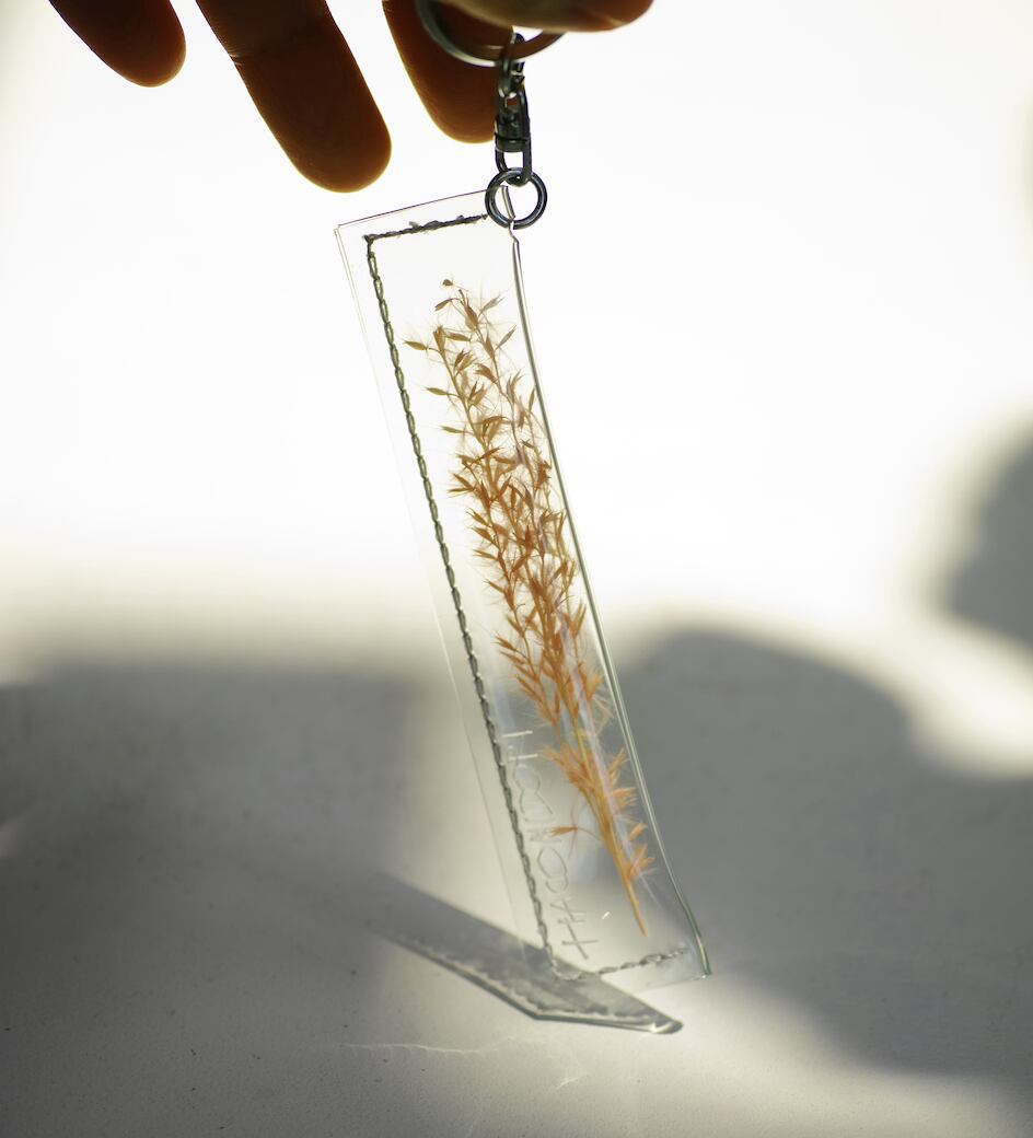 元々 鞄制作の現場から出た端布に、ふと植物を封入してみた事がきっかけで誕生した作品。