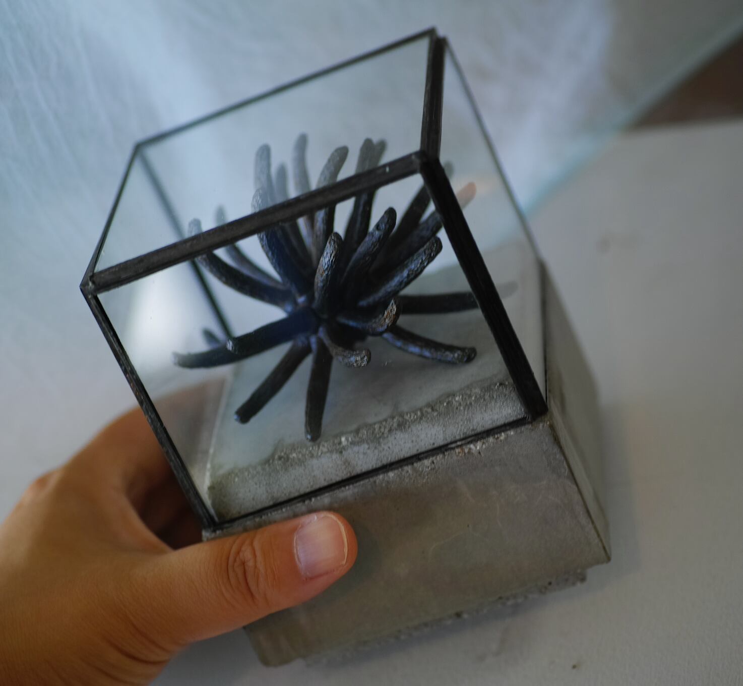 仕様:セメントで成形した土台の上にドライフラワー(スパイダーガム・クロウ)を載せ、ガラスケースを被せてあります(お写真2枚目からご確認をお願いします)