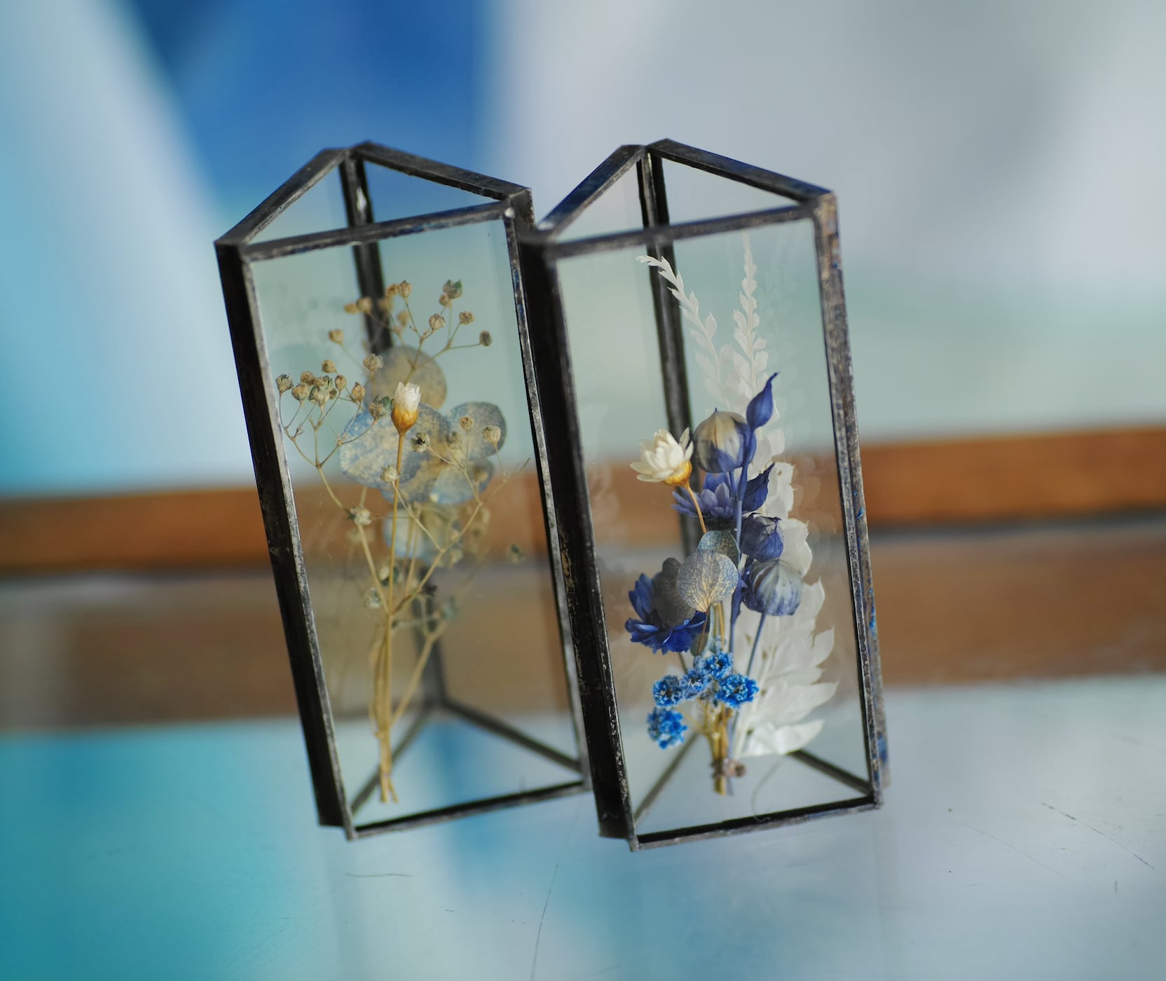 植物を三角ガラス容器に挟み込みました。縦置き・横置きどちらも可。