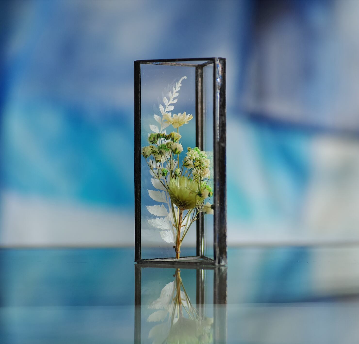 植物を三角ガラス容器に挟み込みました。縦置き・横置きどちらも可。