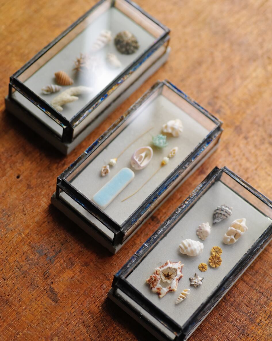 仕様:セメントで成形した土台の上に貝殻とドライフラワーを接着し、ガラスケースを被せてあります(貝殻、ドライフラワー、ガラスケース全て接着による固定済みです)。