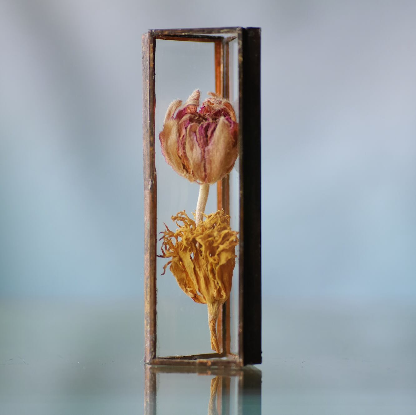 植物を三角ガラス容器に挟み込みました。縦置き・横置きどちらも可。