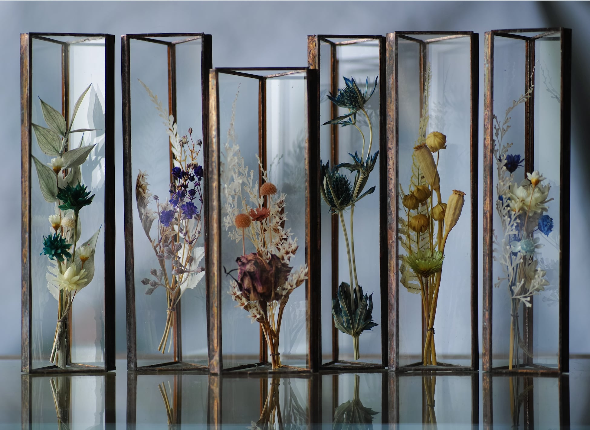 植物を三角ガラス容器に挟み込みました。縦置き・横置きどちらも可。