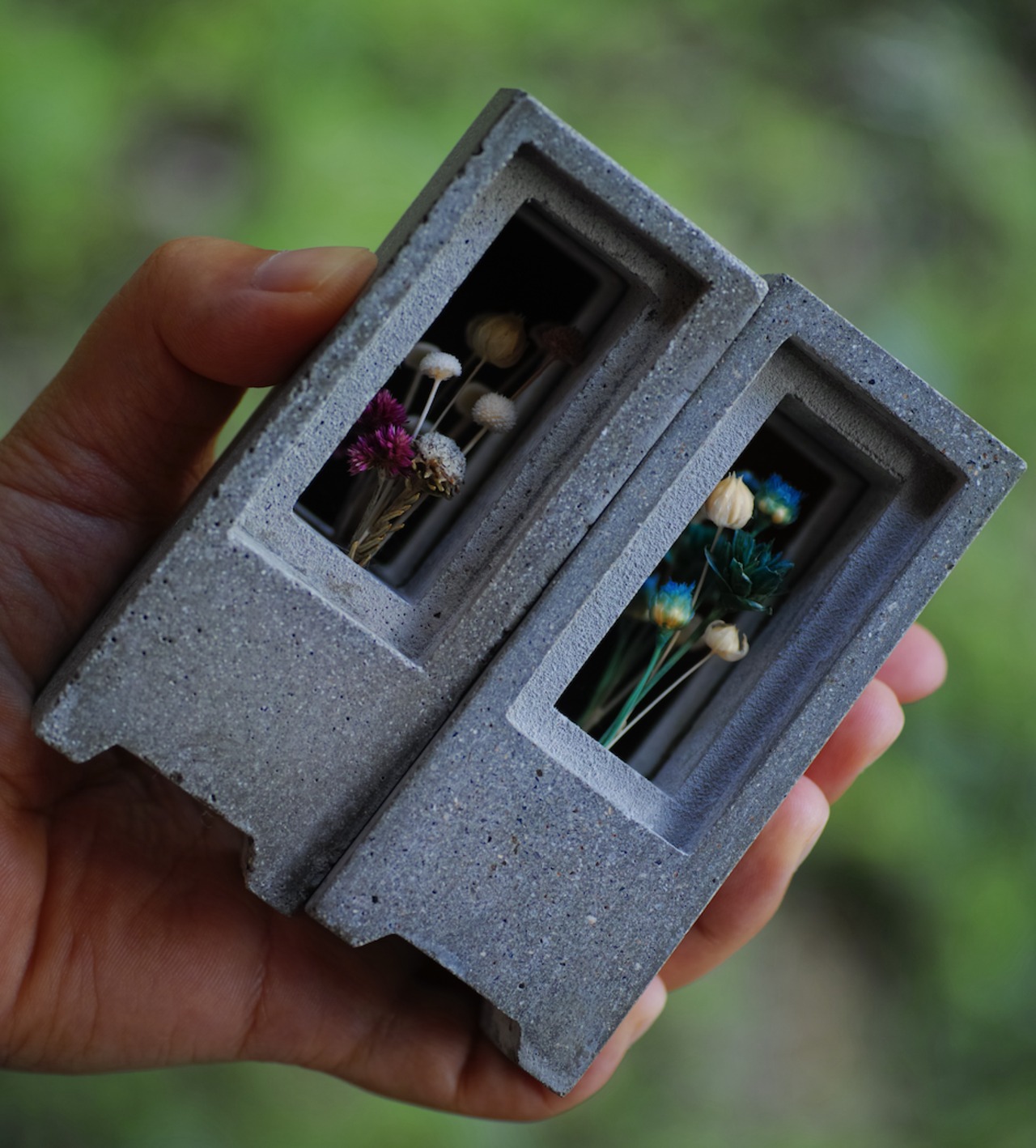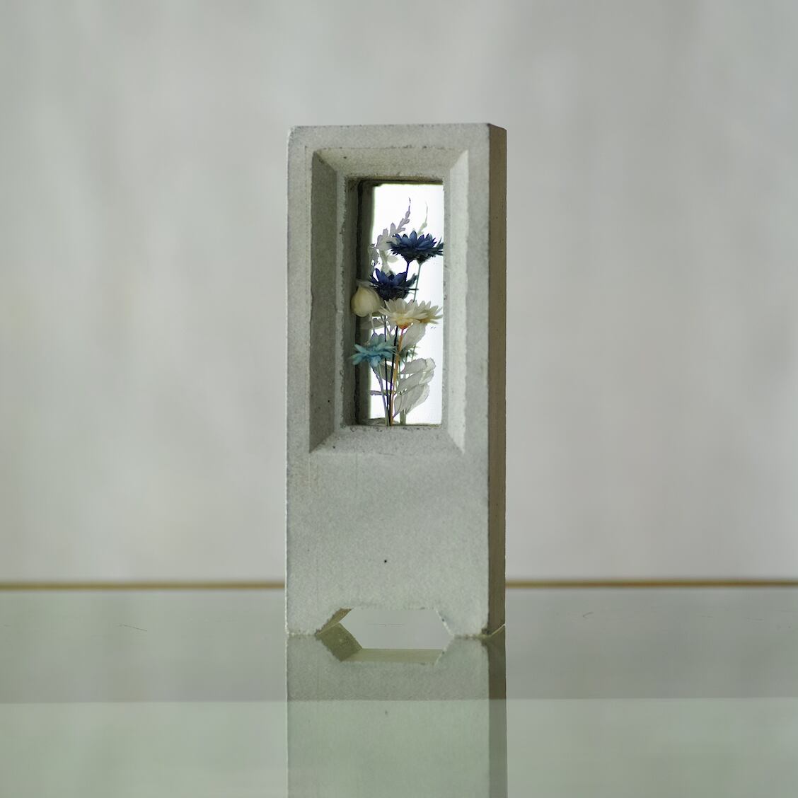 仕様:セメントで成形したオブジェの中にプリザーブドフラワー or ドライフラワーを植栽してあります。背面に鏡をあしらっています。
