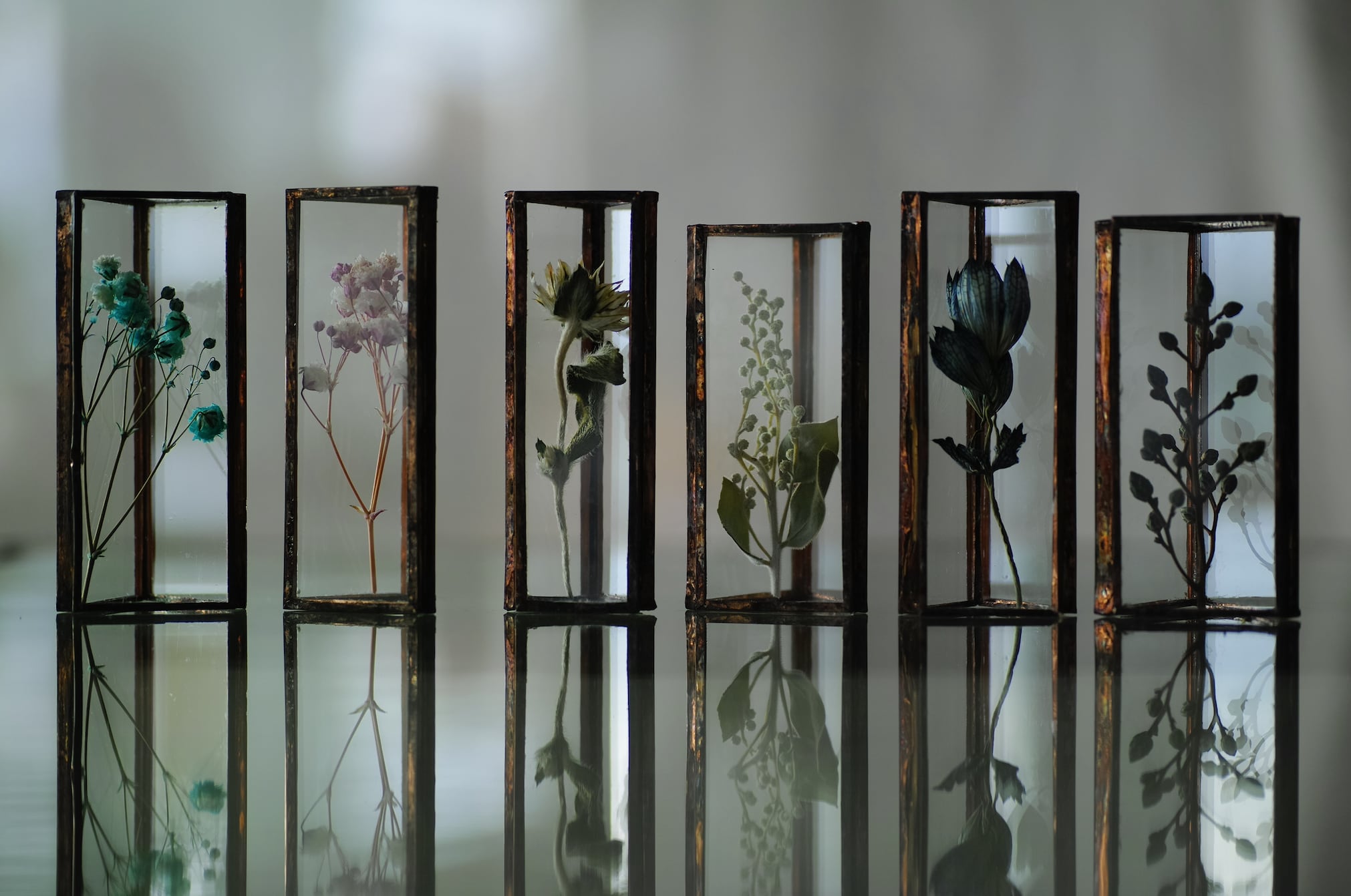 植物を三角ガラス容器に挟み込みました。縦置き・横置きどちらも可。