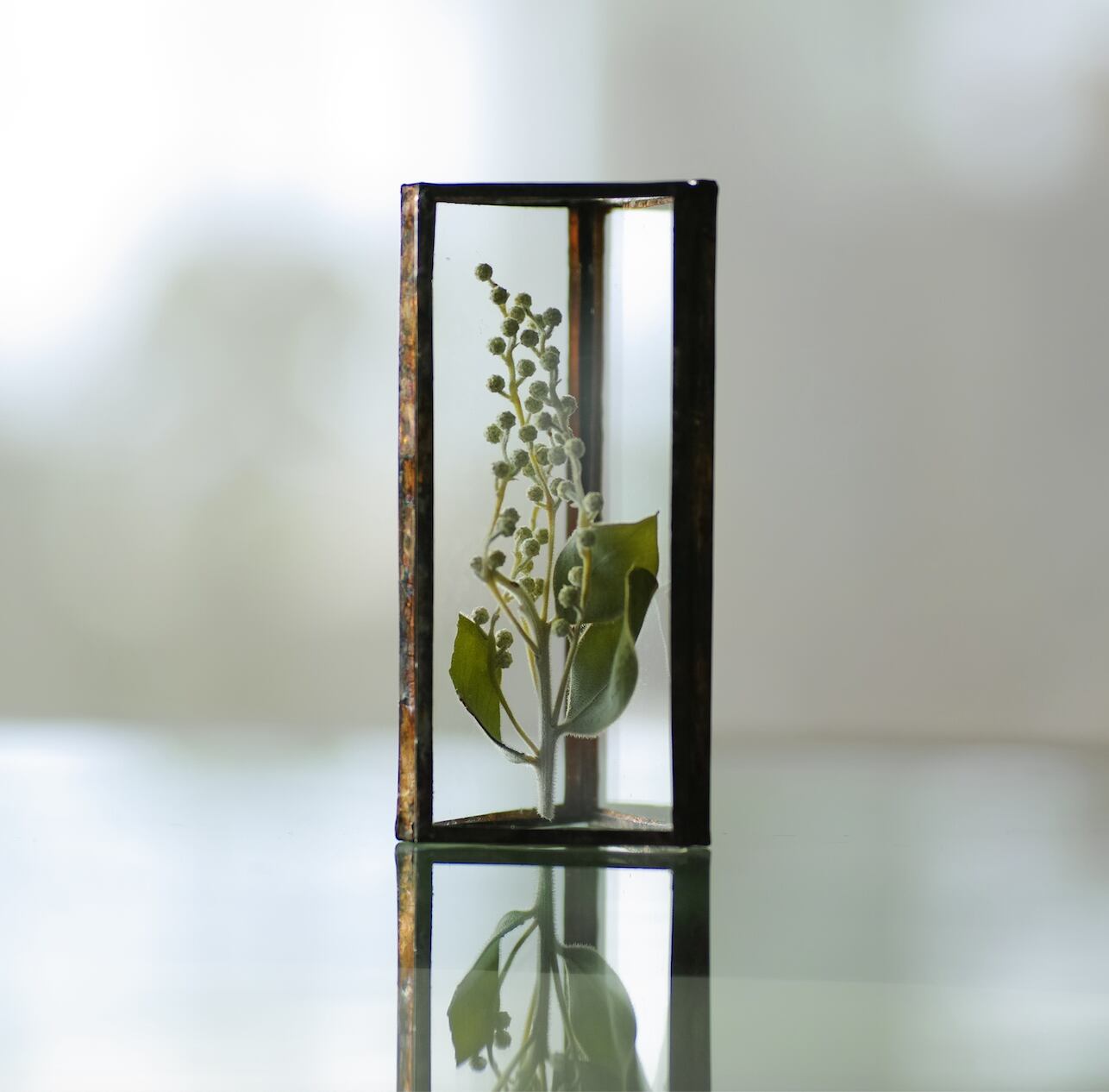 植物を三角ガラス容器に挟み込みました。縦置き・横置きどちらも可。
