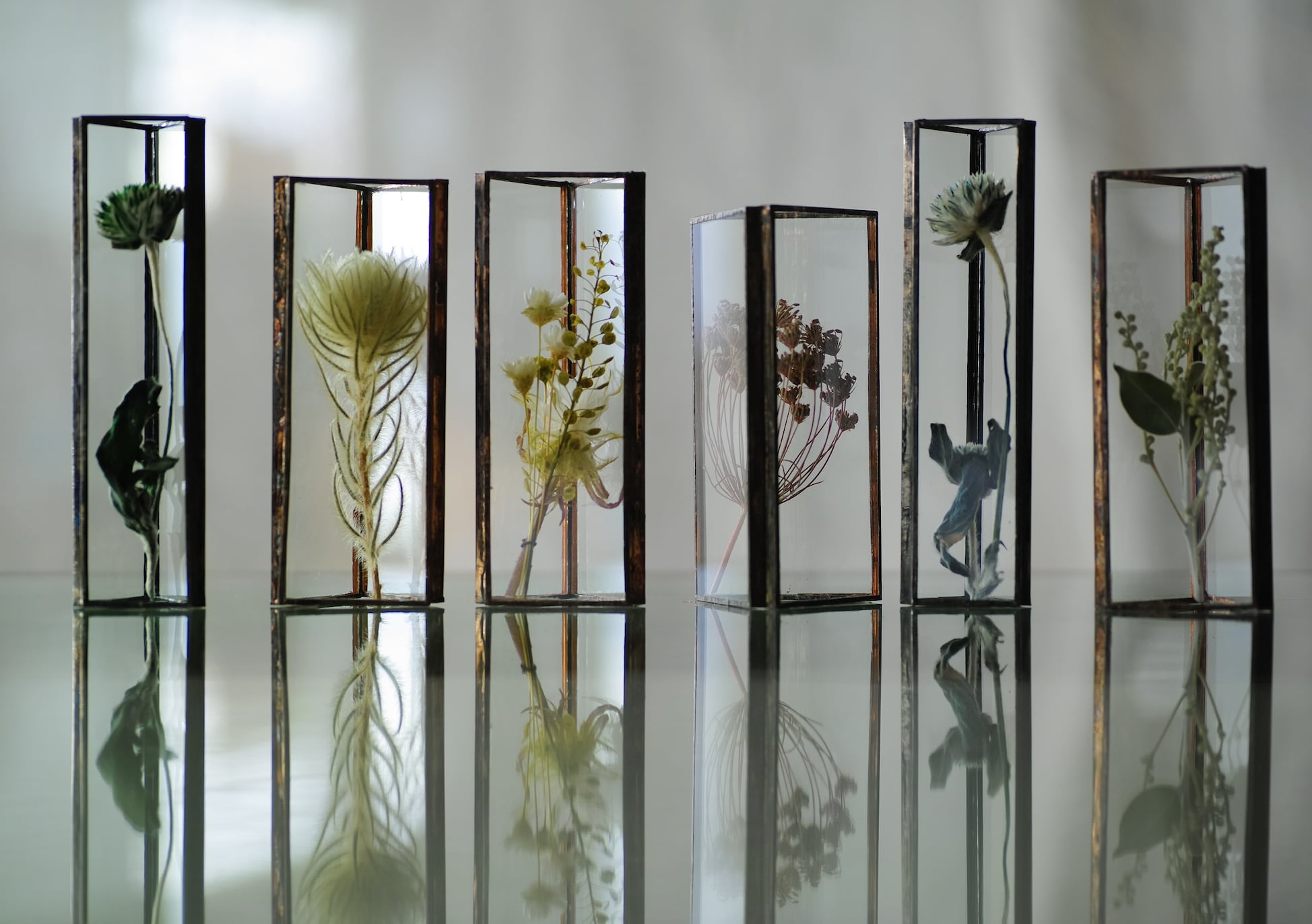 植物を三角ガラス容器に挟み込みました。縦置き・横置きどちらも可。