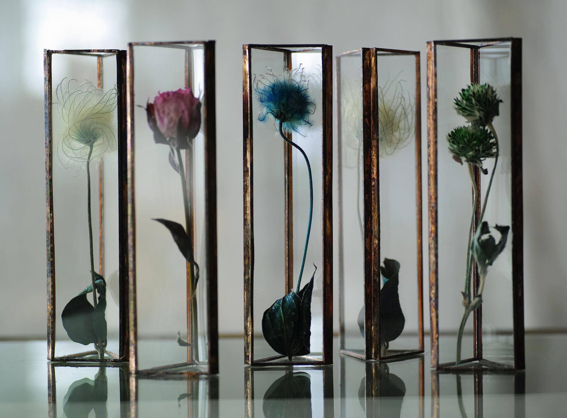 植物を三角ガラス容器に挟み込みました。縦置き・横置きどちらも可。