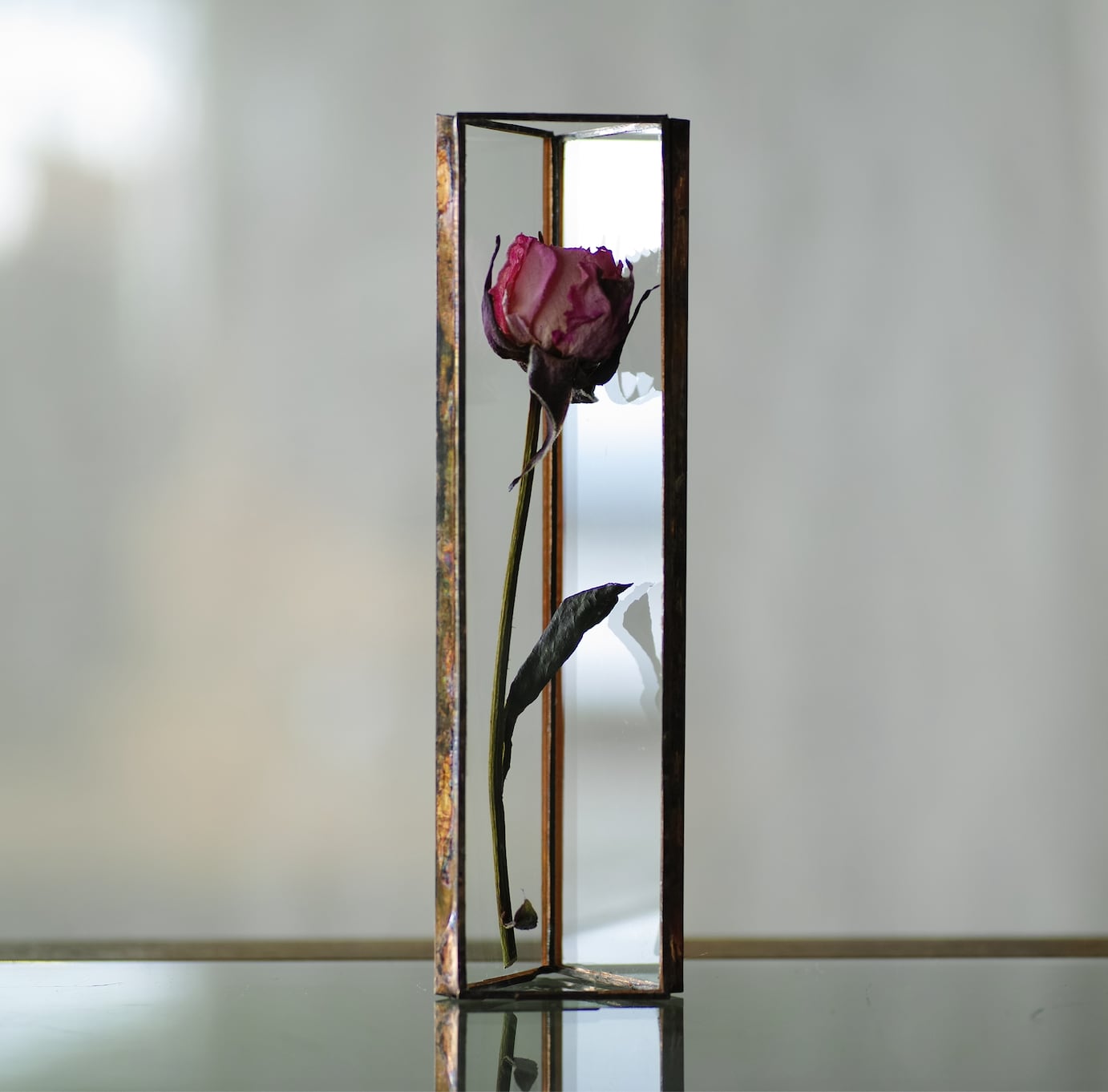 植物を三角ガラス容器に挟み込みました。縦置き・横置きどちらも可。