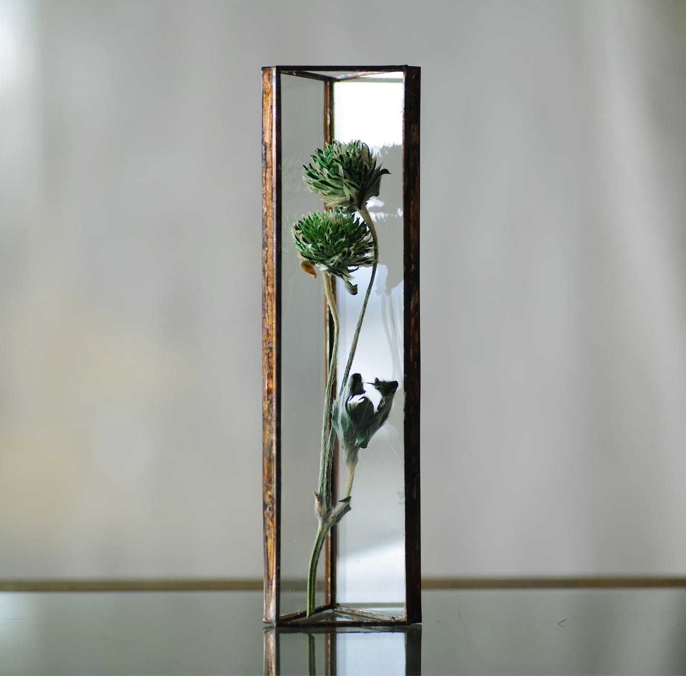 植物を三角ガラス容器に挟み込みました。縦置き・横置きどちらも可。