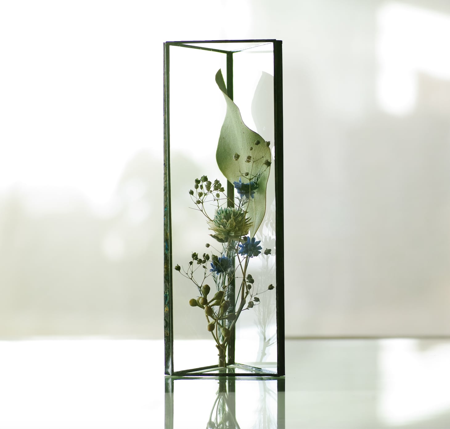 植物を三角ガラス容器に挟み込みました。縦置き・横置きどちらも可。