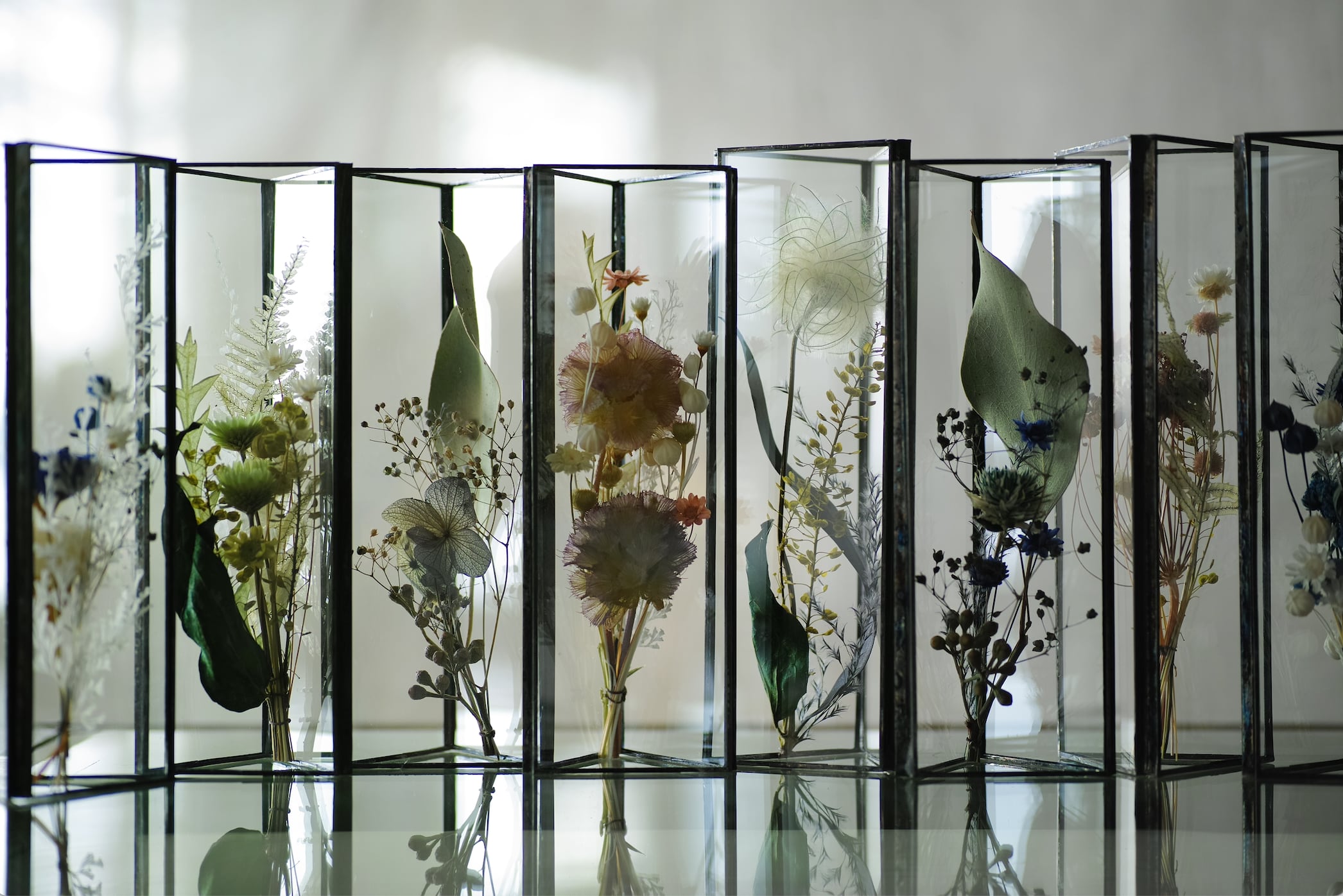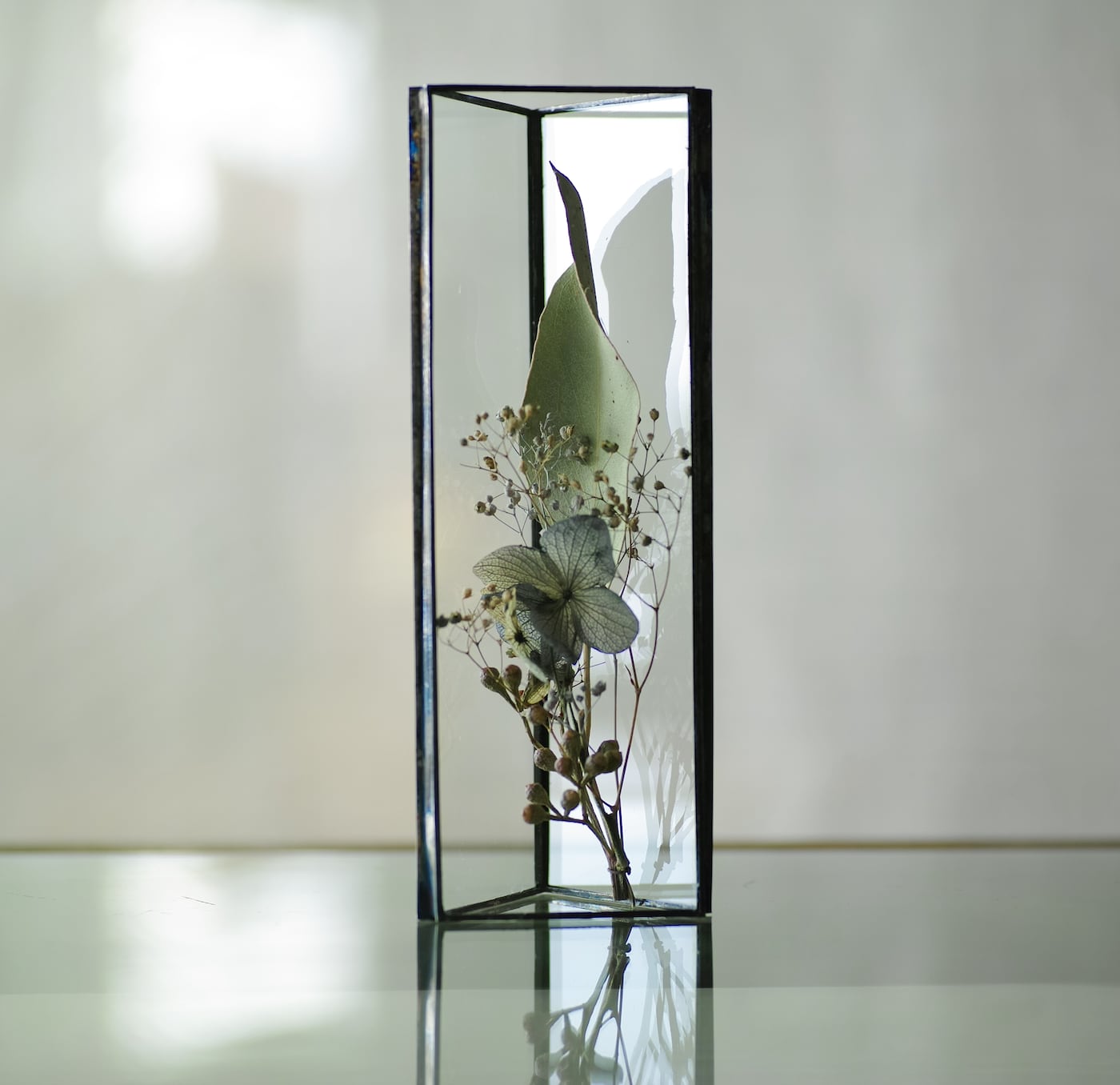 植物を三角ガラス容器に挟み込みました。縦置き・横置きどちらも可。