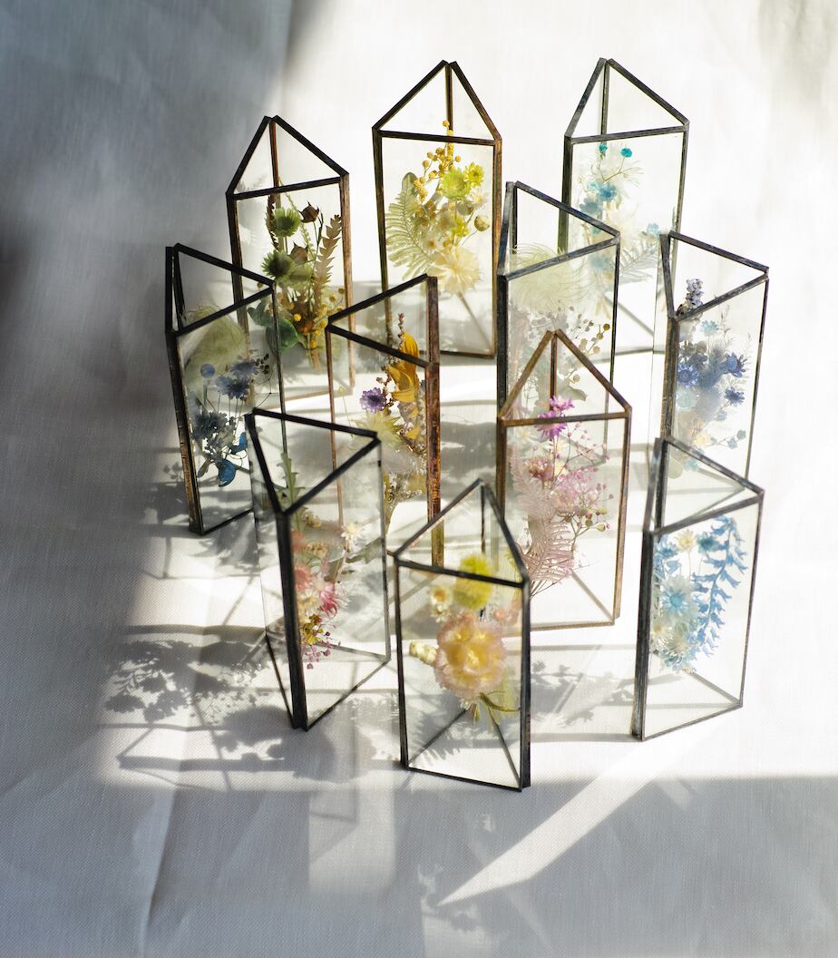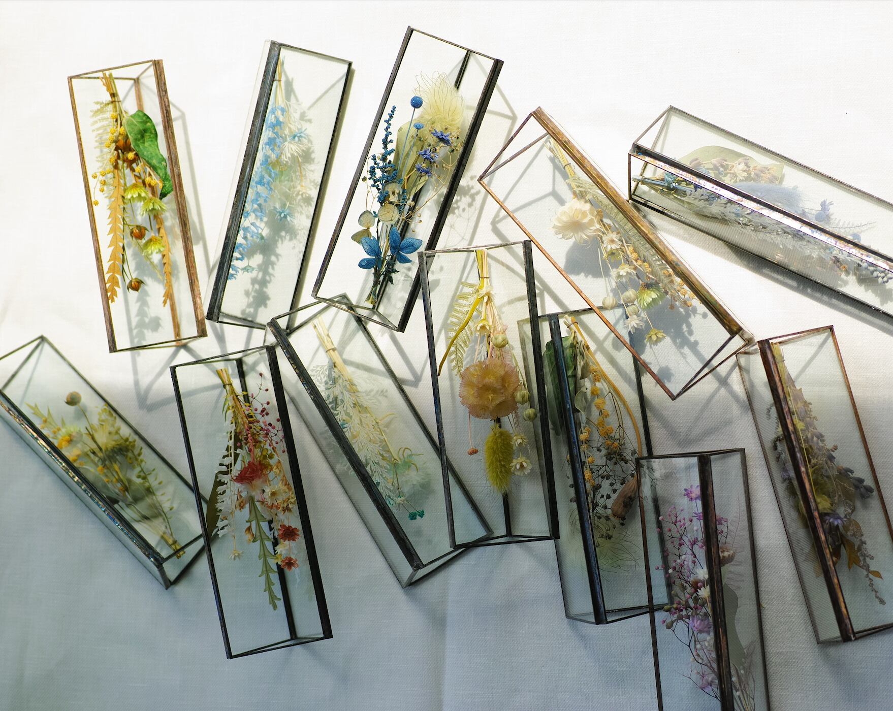 I use recycled glass from demolished old houses and preserved flowers in my creations.