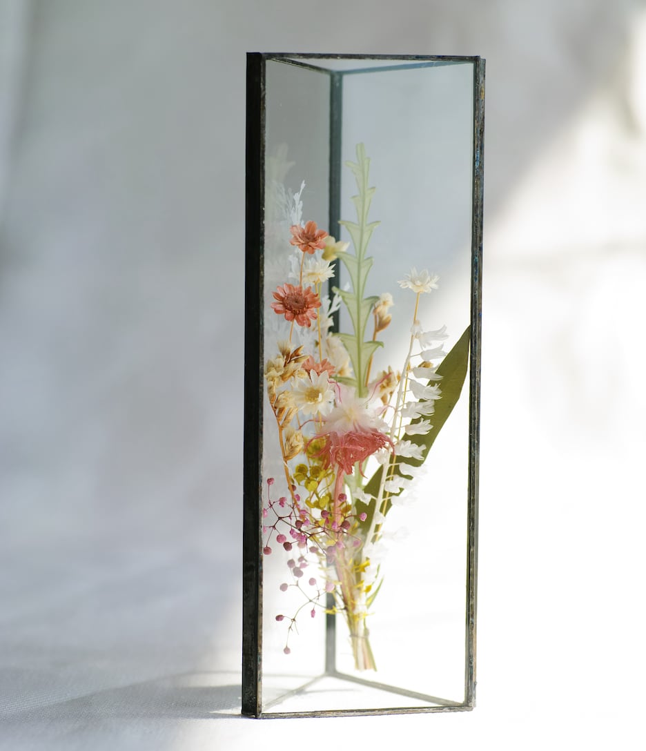 植物を三角ガラス容器に挟み込みました。縦置き・横置きどちらも可。