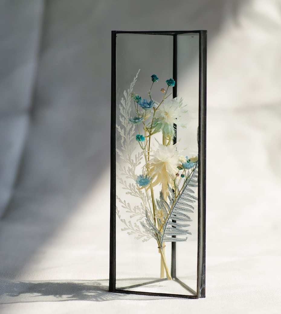 I use recycled glass from demolished old houses and preserved flowers in my creations.