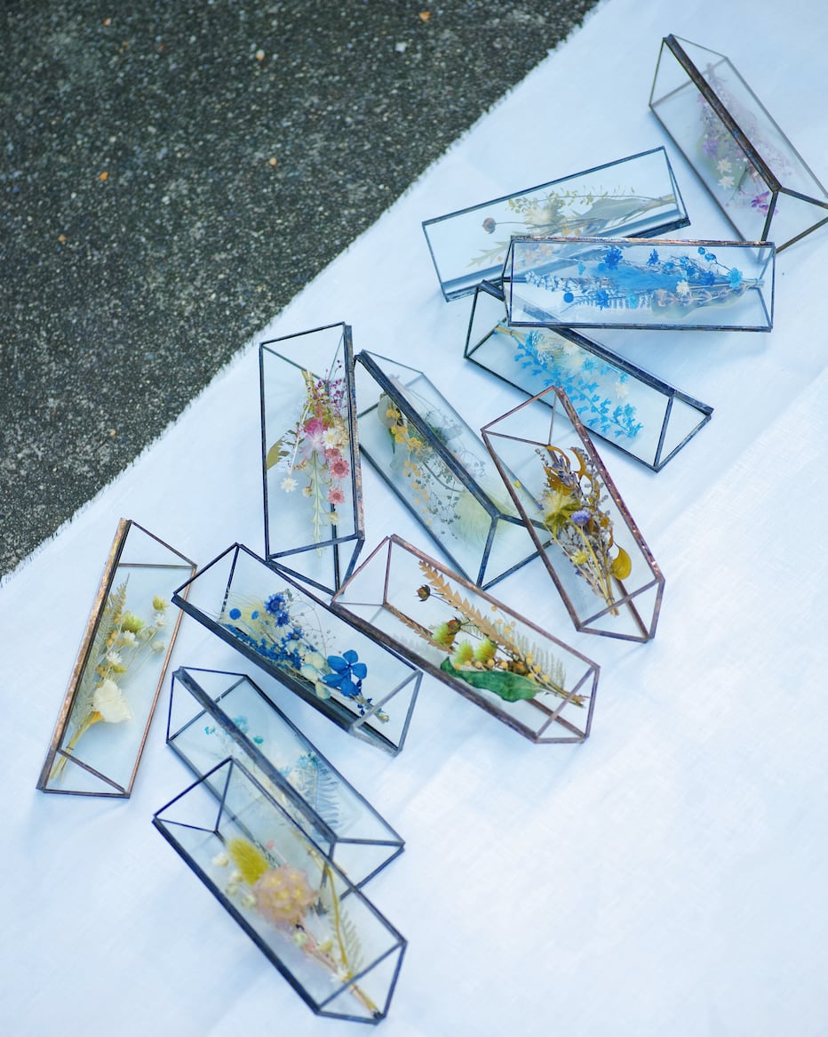 I use recycled glass from demolished old houses and preserved flowers in my creations.