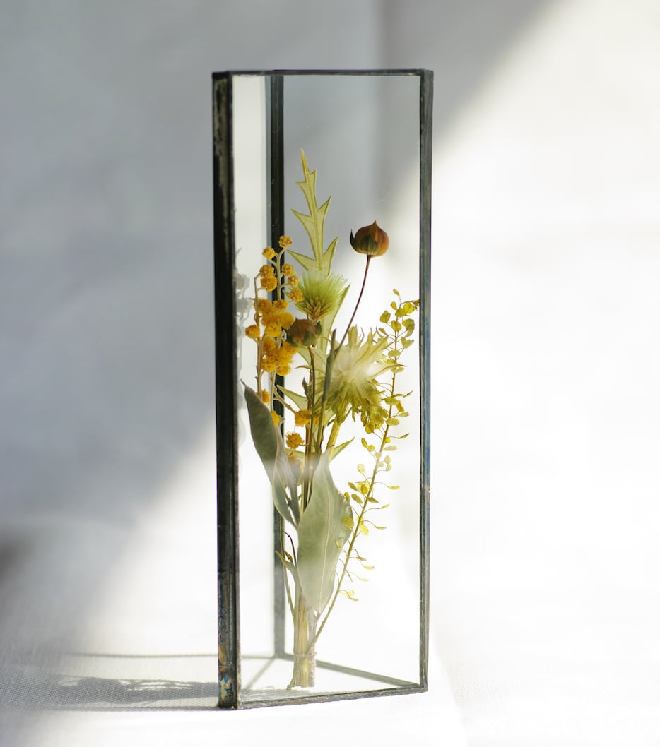 植物を三角ガラス容器に挟み込みました。縦置き・横置きどちらも可。