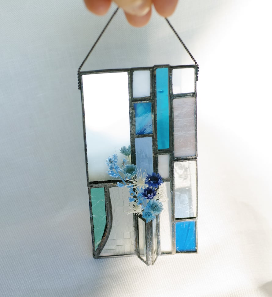 I use recycled glass from demolished old houses and preserved flowers in my creations.