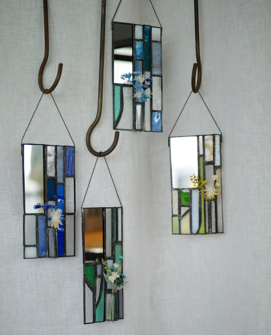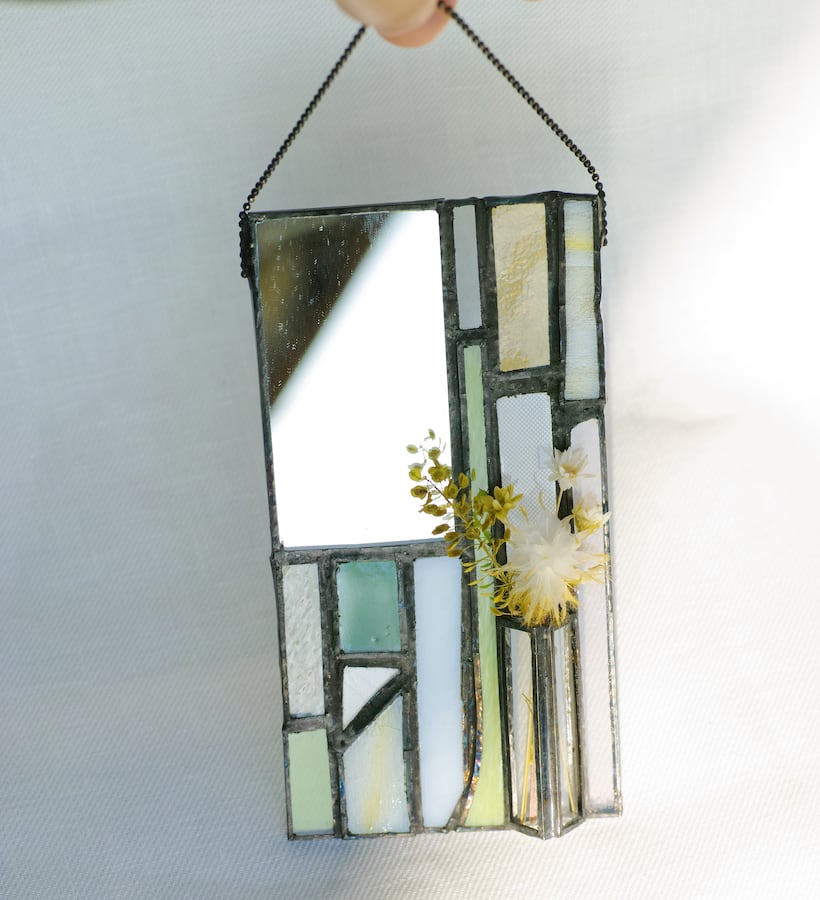 I use recycled glass from demolished old houses and preserved flowers in my creations.