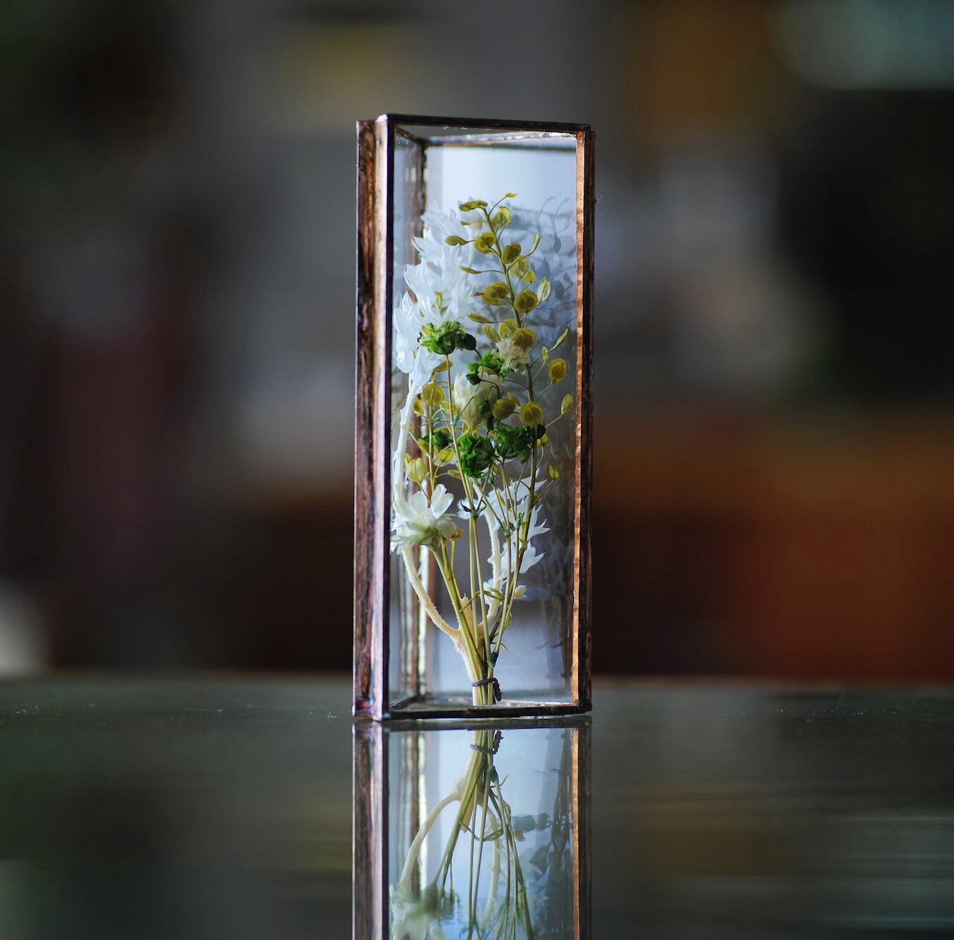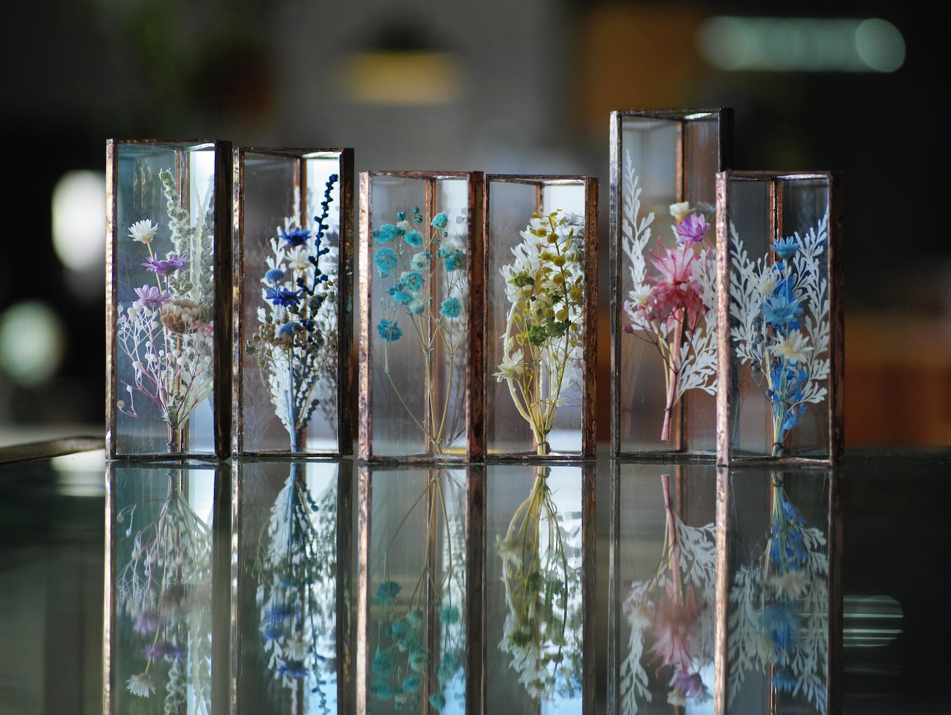 I use recycled glass from demolished old houses and preserved flowers in my creations.
