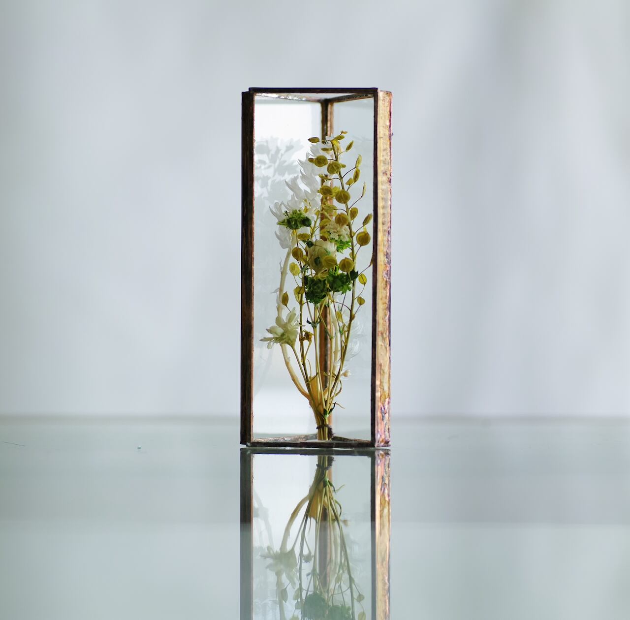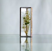 植物を三角ガラス容器に挟み込みました。縦置き・横置きどちらも可。