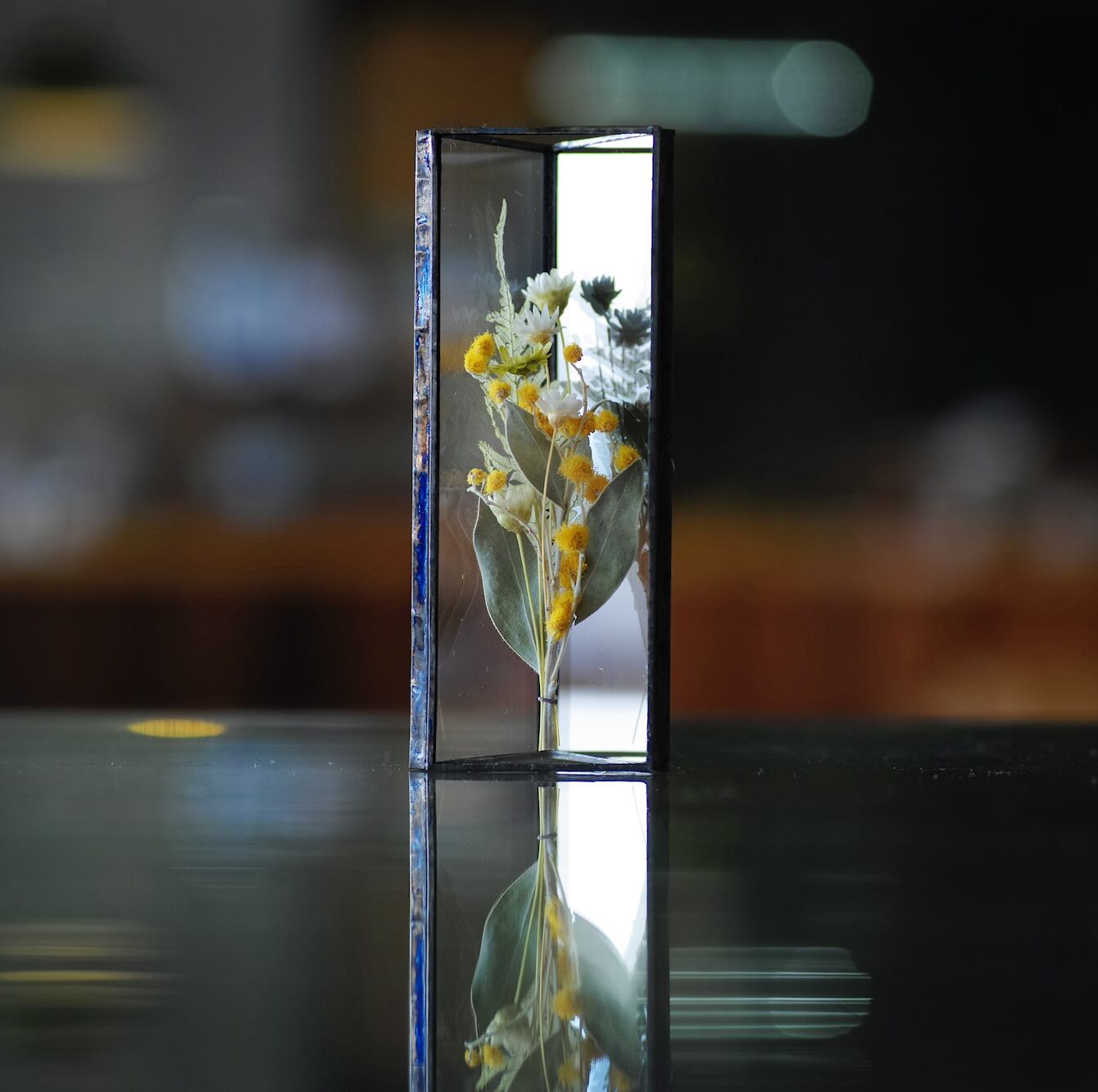I use recycled glass from demolished old houses and preserved flowers in my creations.