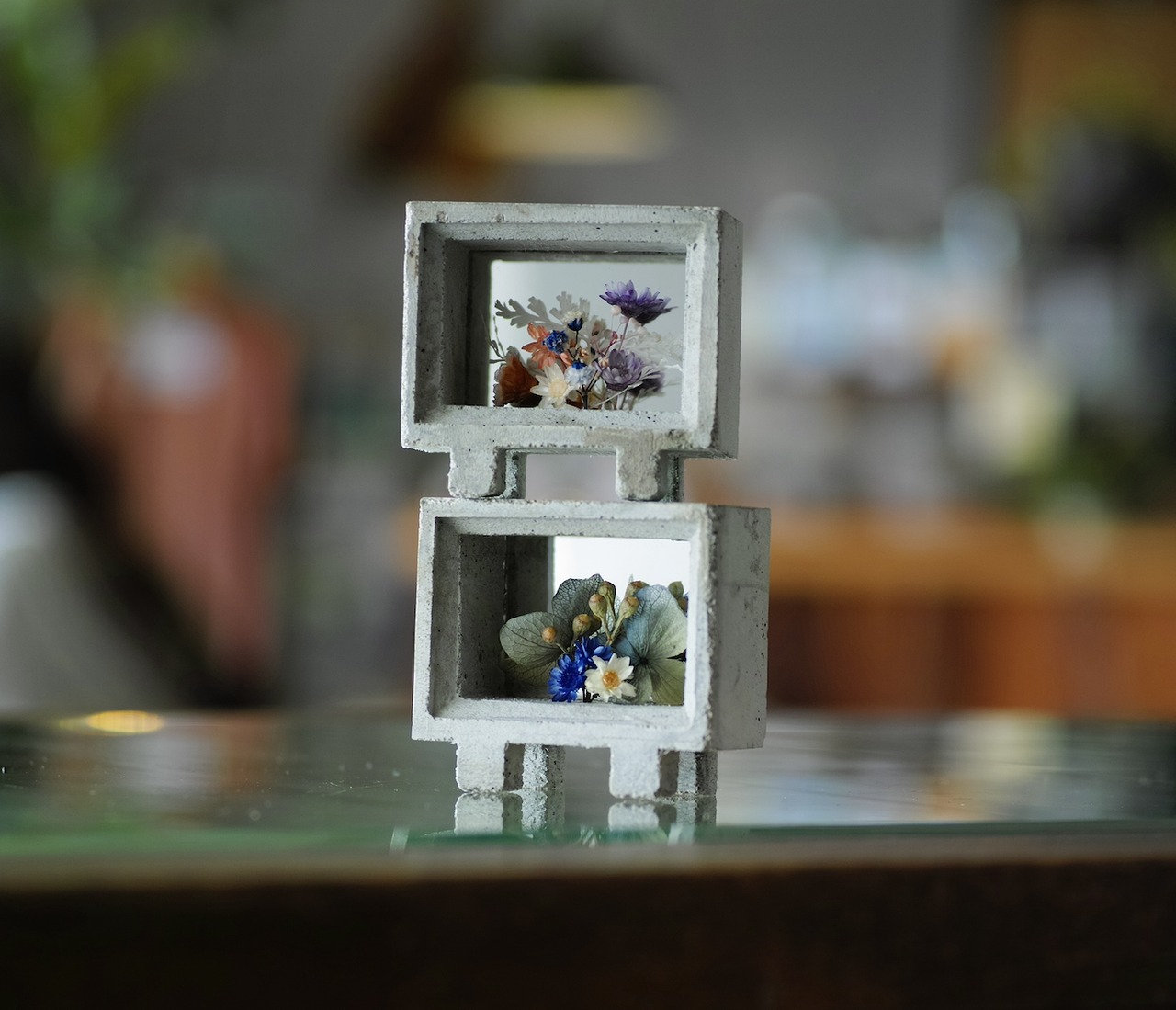 仕様:セメントで成形したオブジェの中にプリザーブドフラワー or ドライフラワーを植栽してあります。背面に鏡をあしらっています。